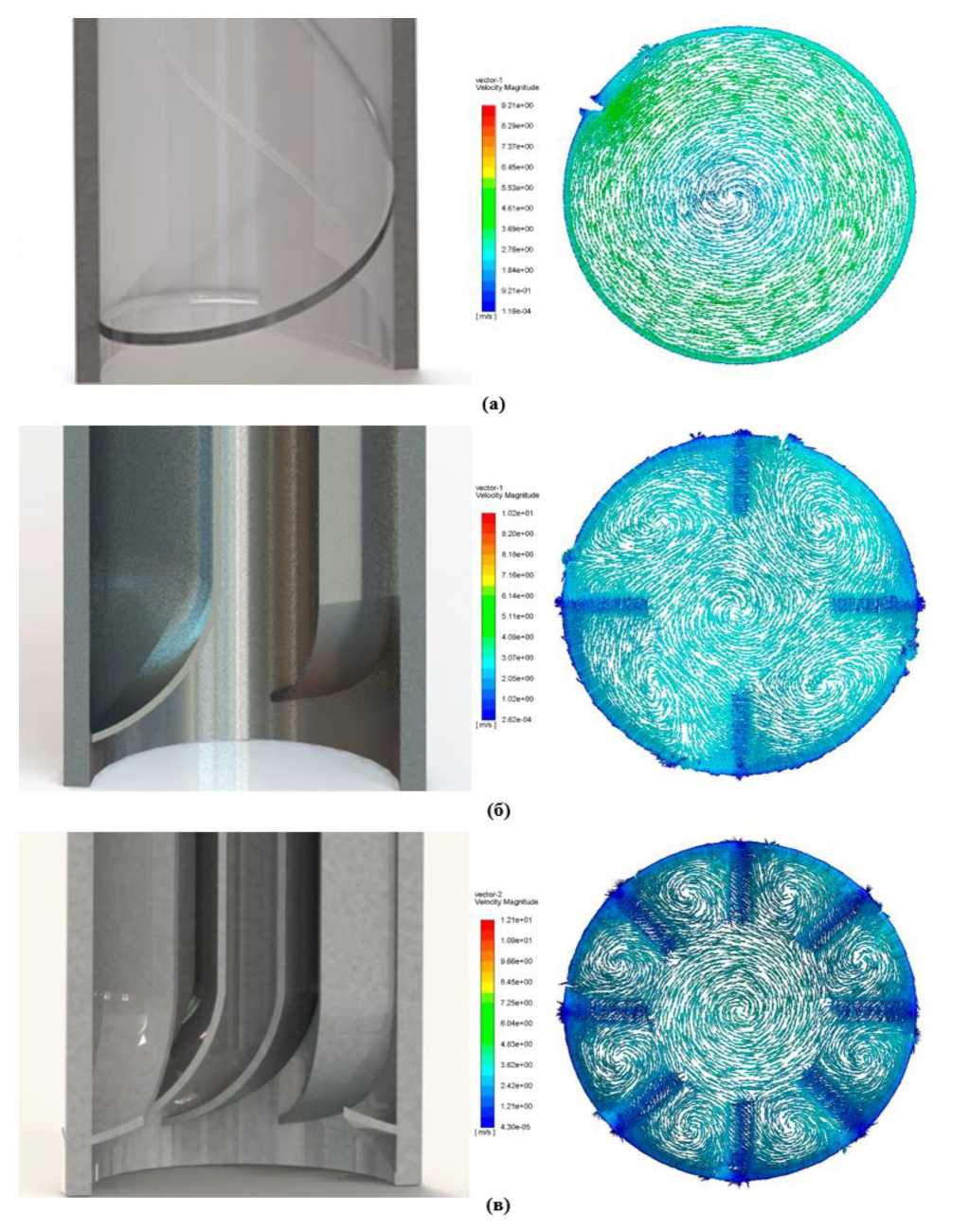Fig. 5. Geometry of straightener and velocity fields in a typical section: а – spiral winding; б – ribs with «smooth entry» and 90° pitch; в – ribs with «smooth entry» and 45° pitch