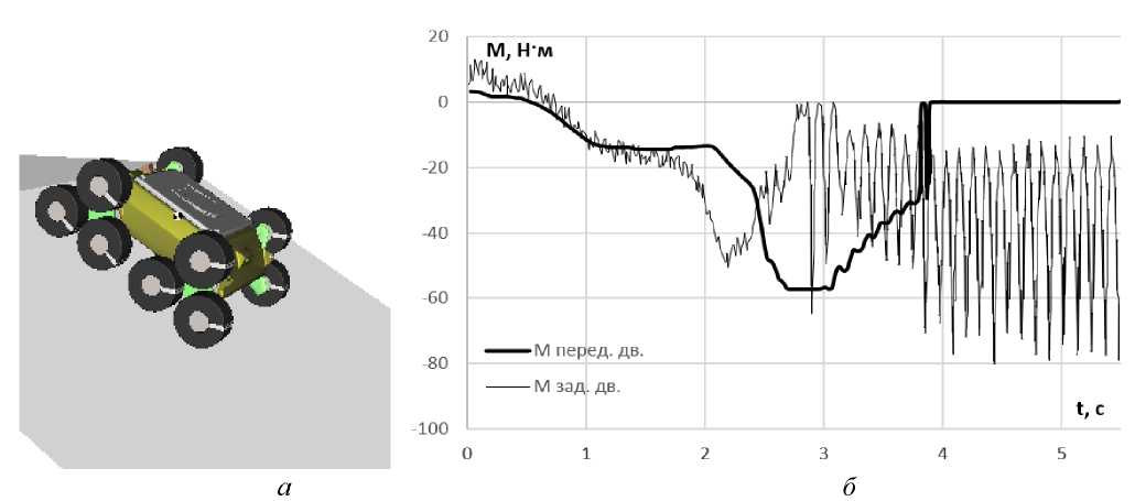 Fig. 6. Overcoming the drain: а – simulation of overcoming the drain with rear propulsions; б – moments at the input to the onboard gearboxes of the propulsions of the robot’s left side