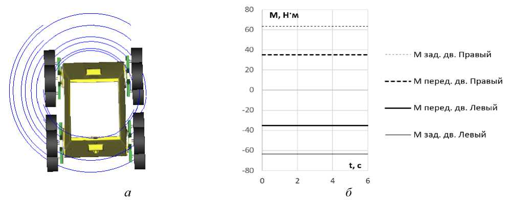 Рис. 9. Разворот на месте: а – траектории деталей робота при развороте; б – моменты на входе в бортовые редукторы движителей