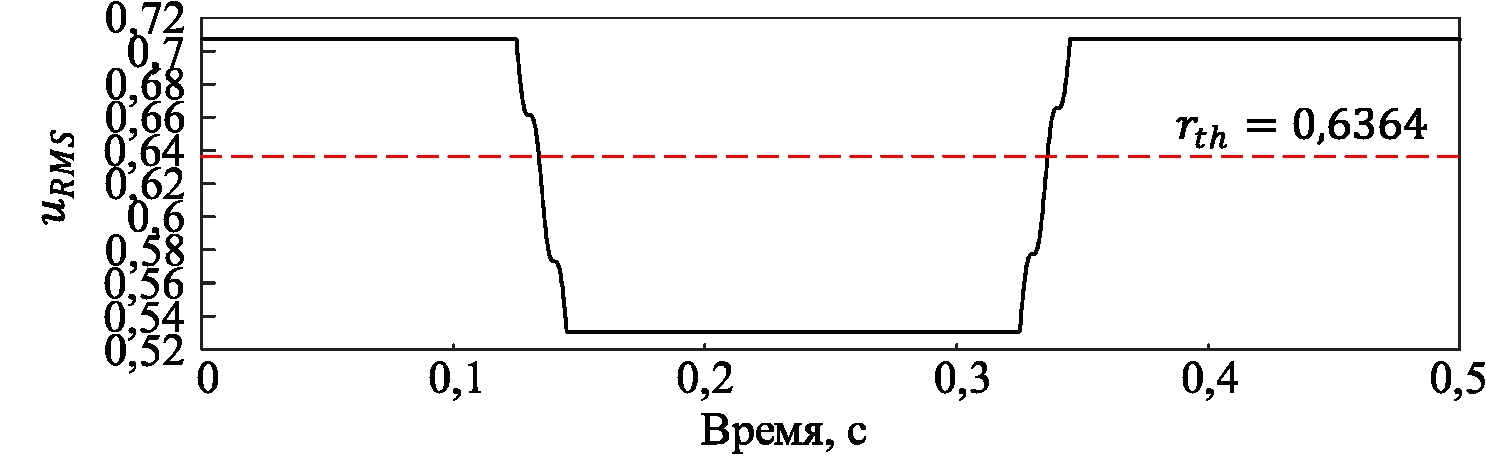 Результат обнаружения сигнала напряжения с провалом 15 % методом RMS с окном в 1 период и шагом перемещения 1 показан на рис. 4. RMS нормального напряжения составляет 0,7071. Когда RMS ниже порогового значения rth= 0,634, считается, что обнаружено провала напряжения на 15 %.
