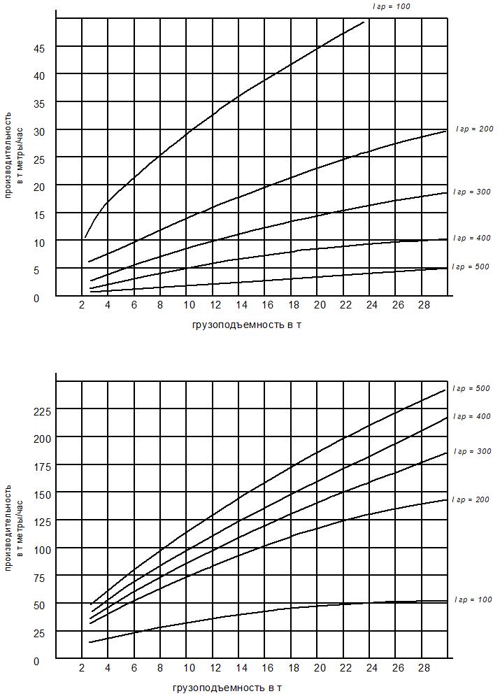 в) наиболее существенное изменение средней технической скорости (1 км/час на 1 т) наблюдается у погрузочно-транспортных машин малой и средней грузоподъемности (до 6-7 т), тогда как при дальнейшем повышении грузоподъемности (с 7 до 27 т средняя техническая скорость изменяется весьма незначительно (0,25 км/час на 1 т).