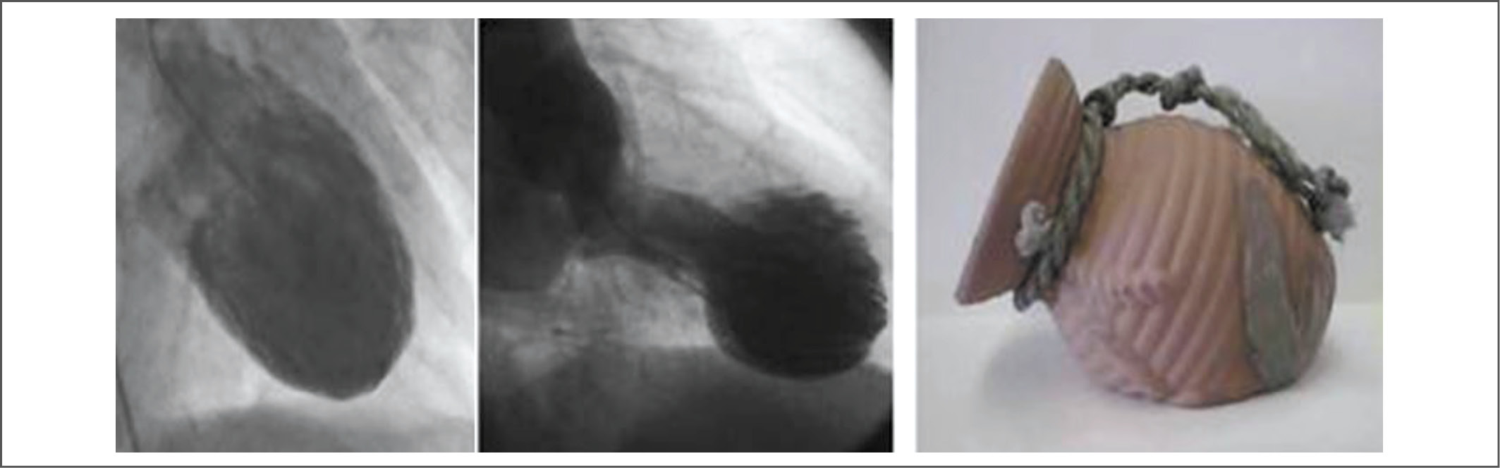 Рис. 1. Результаты вентрикулографии. Размеры ЛЖ в диастолу (слева). Признаки систолического (средний рис.) баллонирования верхушки ЛЖ при кардиомиопатии такоцубо. Горшок для ловли осьминога (справа).