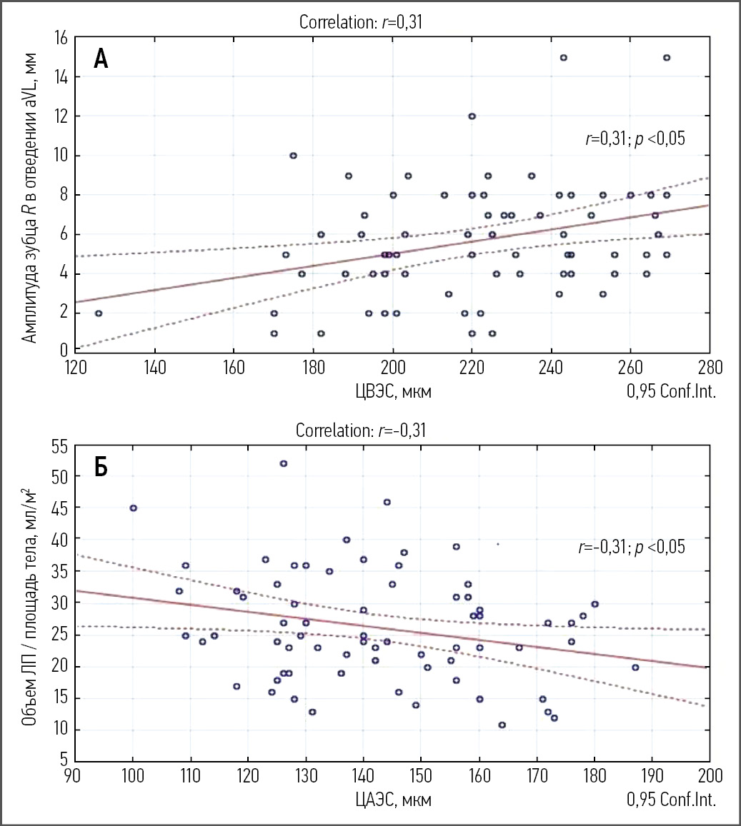 Рис. 1. Позитивная корреляция амплитуды зубца R в отведении aVL и ЦВЭС (фрагмент А); негативная корреляция индекса объёма левого предсердия и ЦАЭС (фрагмент Б) у пациентов с неосложнённой артериальной гипертензией (средний возраст 49,7±4,8 лет). Примечание. ЛП – левое предсердие, ЦВЭС – центральный венулярный эквивалент сетчатки, ЦАЭС – центральный артериолярный эквивалент сетчатки. Источник: Барсуков А.В. и соавт., 2020 [37]. / Fig. 1. Positive correlation of the R wave amplitude in lead aVL and the central venous retinal equivalent (fragment A), negative correlation of the left atrial volume index and the central arterial retinal equivalent (fragment B) in patients with uncomplicated hypertension (mean age 49.7±4.8 years). Note. ЛП – left atrium; ЦВЭС – central retinal venular equivalent;ЦАЭС – central retinal arteriolar equivalent. Source: Barsukov A.V. и et al., 2020 [37].