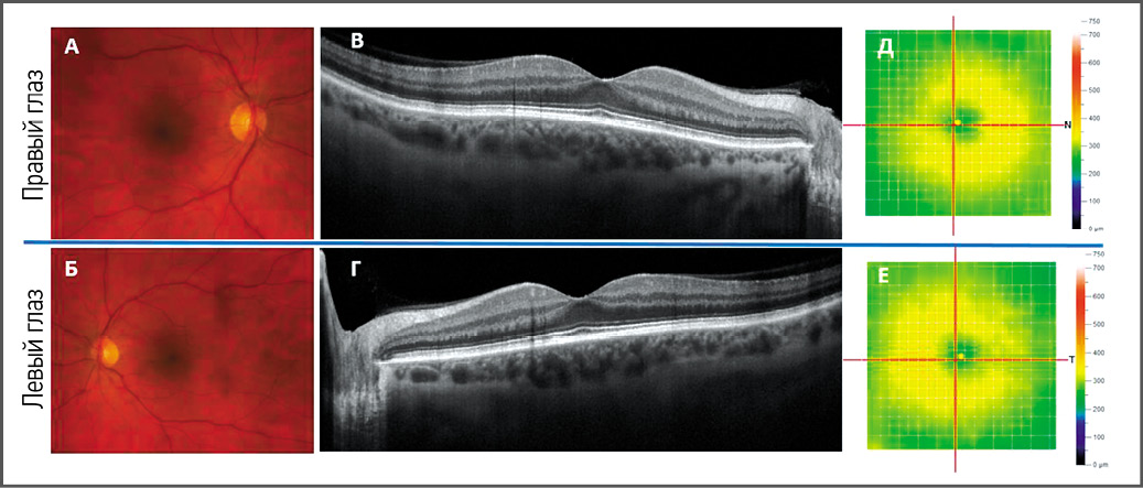 Рис. 3. Изображение цветной фоторегистрации (А, Б), оптической когерентной томографии (В, Г), тепловой карты сетчатки (Д, Е) у пациентки З. 61 года с контролируемой (ранее злокачественной) артериальной гипертензией (исследование сетчатки выполнено в 2022 году). Примечание. На фрагментах А–Г не определяются твёрдые экссудаты, на фрагментах А, Б не выявляются «ватные» очаги и интраретинальные кровоизлияния; здесь же отмечается изменение диаметра сосудов: АВС 1:2; артериовенозные перекрёсты 1-й стадии. На фрагментах Д, Е – нормализация толщины сетчатки вследствие исчезновения её отёчности вблизи диска зрительного нерва. Источник: ранее не опубликованные данные. / Fig. 3. Image of color photographic recording (fragments A, B), optical coherence tomography (fragments C, D), heat map of the retina (fragments D, F) in female Z, 61 years old, with controlled (previously malignant) hypertension (retinal examination performed in 2022). Note. Fragments А–Г do not show solid exudates; fragments A and B showno “cotton” foci and intraretinal hemorrhages; there is also a changein the diameter of the vessels: arteriovenous ratio (AVS) 1:2; arteriovenous crossings of the 1st stage. Fragments Д, Е show normalization of the thickness of the retina due to the disappearance of its edema near the optic nerve head. Source: previously unpublished data.