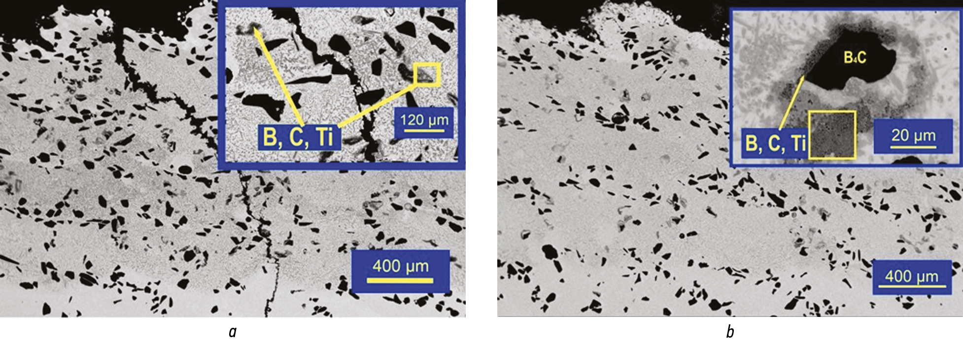 СЭМ-изображения при большем увеличении демонстрируют сходную микроструктуру с предварительным нагревом и без него (см. рис. 3, a и b соответственно). Частицы карбида бора в обоих случаях подвергаются растворению, как показано желтыми квадратами. Матрица также имеет аналогичную структуру, содержащую игольчатые и равноосные частицы.