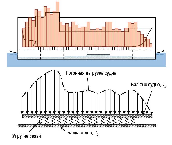 При доковых операциях — постановке судна в плавучий док происходит общий продольный изгиб системы док-судно. Корпус судна и корпус плавучего дока в общем случае рассматривают как балки переменного сечения (переменной жесткости), соединенные рядом независимых упругих опор, жесткость которых определяется жесткостью днищевых конструкций судна, жесткостью конструкций понтона и жесткостью кильблоков (рис. 1).