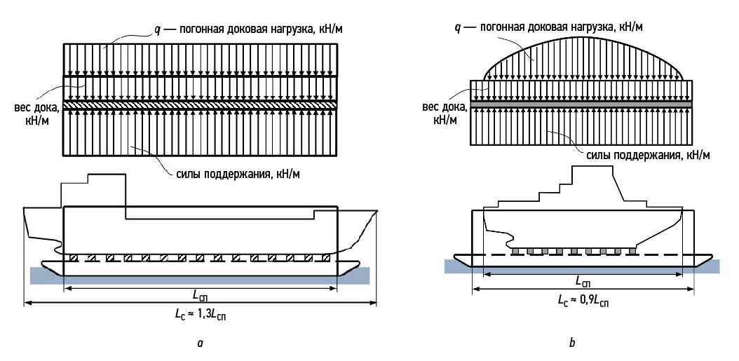 Рис. 2. Характер распределения доковой погонной нагрузки в соответствии с требованиями Правил РМРС для двух расчетных случаев: a — постановка длинного судна; b — постановка короткого судна.