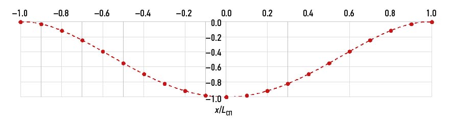 Эпюры изменения параметров формы перегибающего и прогибающего моментов по длине дока представлены на рис. 3 и 4. Их значения можно определить по формулам (3) и (4) в зависимости от безразмерной абсциссы расчетного сечения дока относительно мидель-шпангоута :