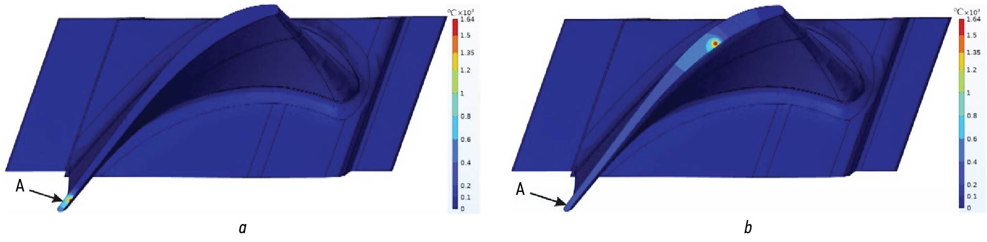 Рис. 9. Модель наплавки пера рабочей лопатки при мощности 300 Вт: a — наплавка в момент времени 2 секунды; b — наплавка в момент времени 73 секунды; А — точка установки термопары.