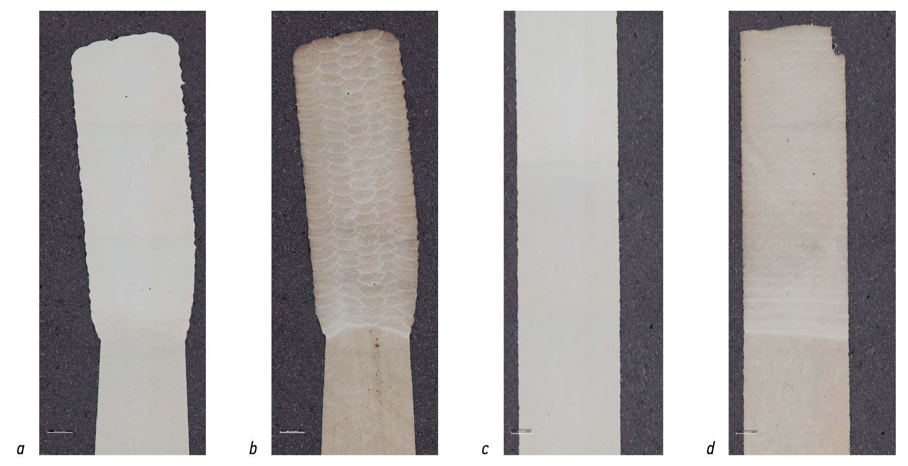 Fig. 11. Cross-section and longitudinal section of the check test piece: a, before etching; b, after etching; c, before etching; d, after etching.