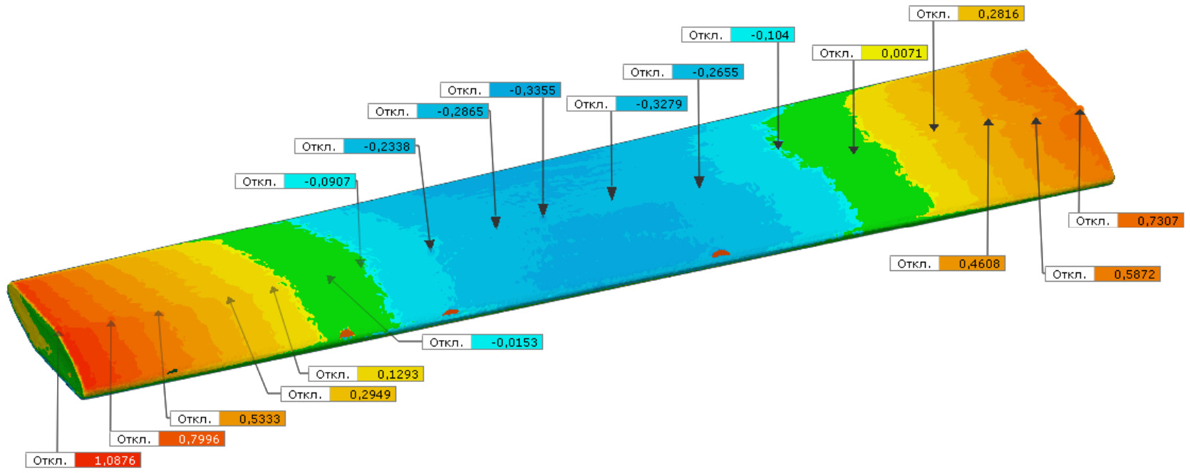 После упрочнения образец был отсканирован с помощью 3D-сканера для контроля деформации пластины. Результаты изменения геометрии образца представлены на рис. 9. Максимальное отклонение после термообработки от первоначального состояния составило 1,09 мм.