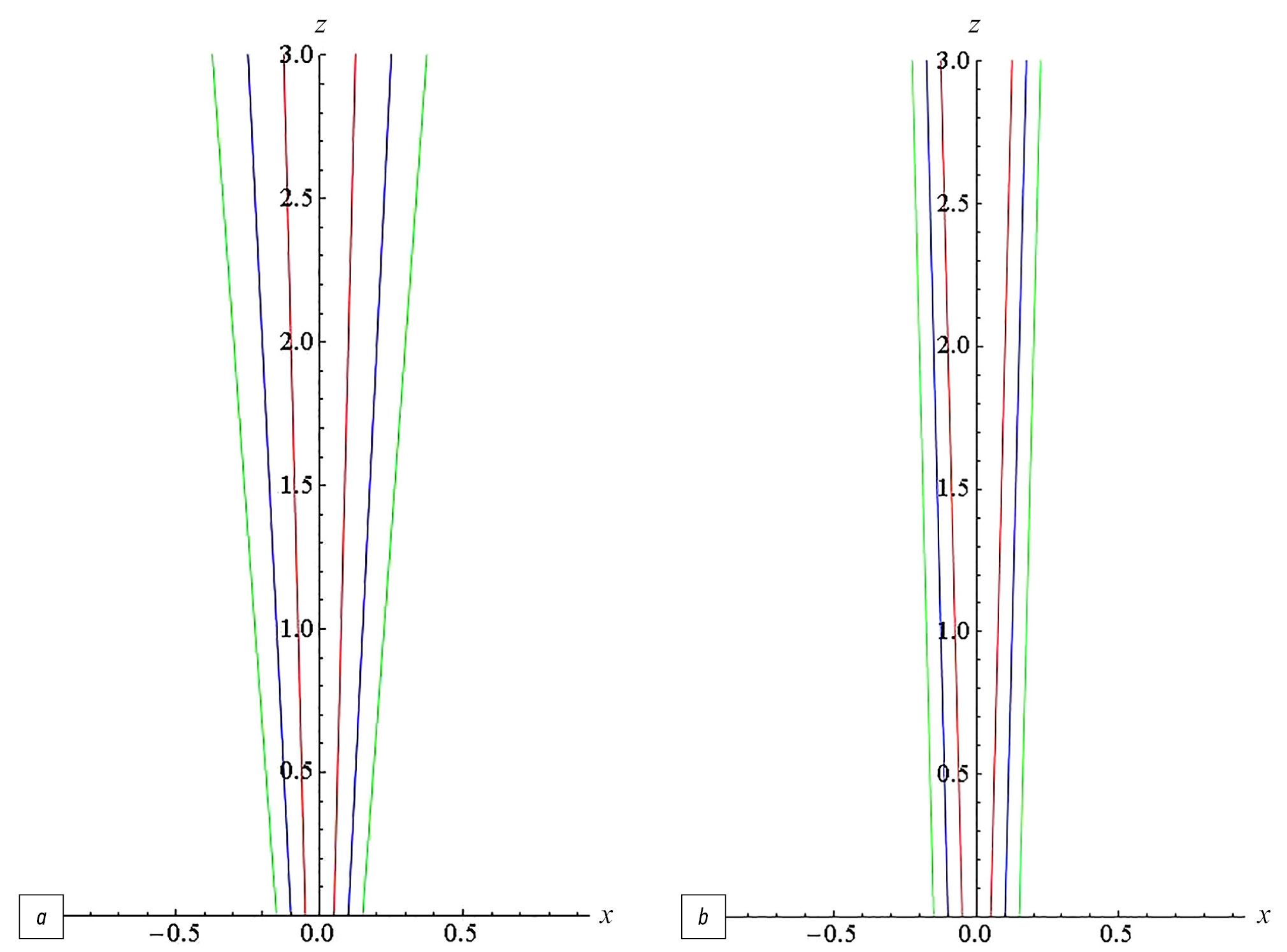На рис. 2, а показаны траектории частиц с разными начальными значениями поперечной координаты : ±0,15 — зеленые линии, ±0,1 — синие линии, ±0,05 — красные линии. Начальные скорости частиц совпадают со скоростью самого потока на выходе из трубочки — , , , .