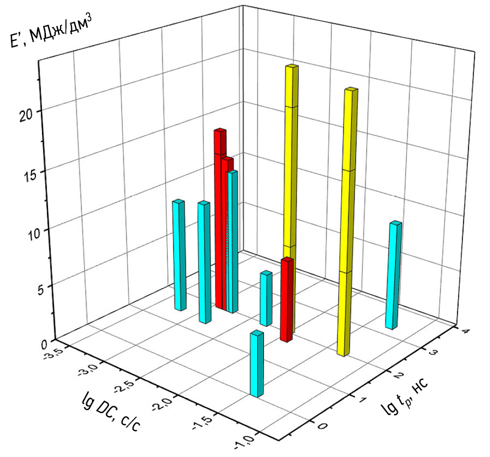 Рис. 5. Параметрическая зависимость для набора данных из трех экспериментальных серий по лазерной очистке различных видов слоев лакокрасочного покрытия-типа (16 точек (6 + 5 + 5)) по данным авторов публикаций [1, 10–12], — зависимость удельных энергозатрат E’ (на единицу площади удаляемого слоя) от двух входных параметров (коэффициента заполнения DC и длительности импульса лазерного излучения tp).