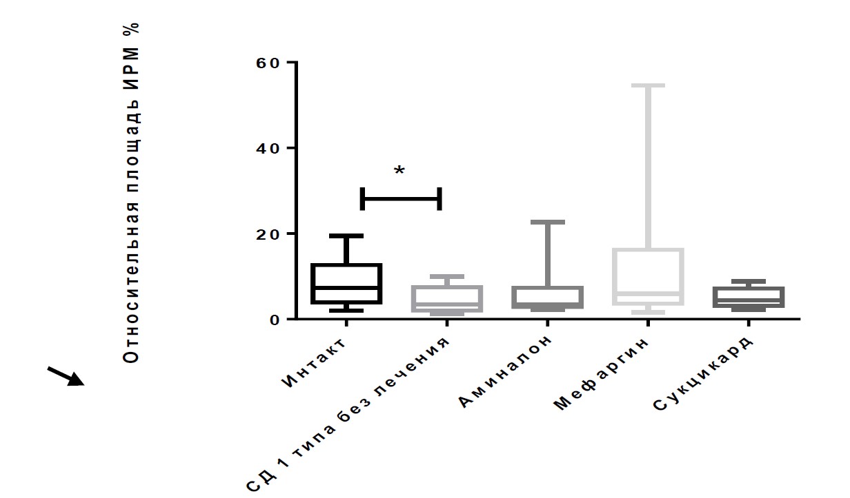 Материал и методы. Моделирование сахарного диабета проводили на белых беспородных лабораторных крысах-самках в возрасте 12 мес. Животные были разделены на 5 групп: группа интакта, группа сахарного диабета 1-го типа без лечения, группа фармакологической коррекции аминалоном, мефаргином и сукцикардом. Сахарный диабет (СД) моделировали однократным внутрибрюшинным введением растворенного в цитратном буфере (0,1 М, рН 4,5) стрептозотоцина (Sigma, США) в дозе 60 мг/кг после 48-часовой пищевой депривации. Лечение начинали через 6 месяцев после моделирования СД. Статистическую обработку полученных результатов проводили методами описательной и аналитической статистики с применением программного обеспечения Prism 6 (GraphPad Software Inc., США).