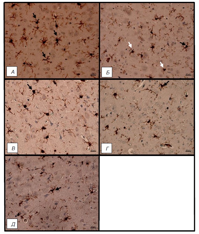 Рис. 2. Снижение экспрессии Iba в первичной соматосенсорной коре при экспериментальной диабетической энцефалопатии: А – интакт-экспрессия ИРМ в микроглии в виде «паучков»; Б. – СД 1-го типа без лечения – экспрессия ИРМ в виде «амебоидной» микроглии; В – СД 1-го типа с лечением аминалоном; Г – СД 1-го типа с лечением мефаргином; Д – СД 1-го типа с лечением сукцикардом. Иммуногистохимическое исследование, антитела против Iba, докраска гематоксилином. Увеличение ×400. Черные стрелки – разветвленная микроглия. Белые стрелки – неразветвленная микроглия