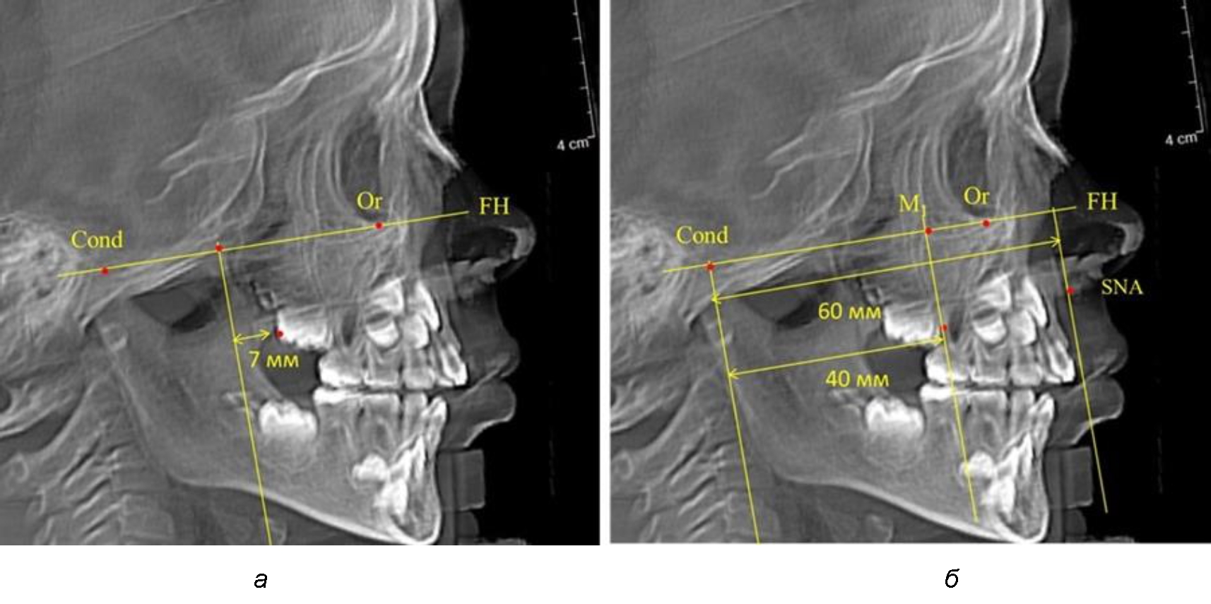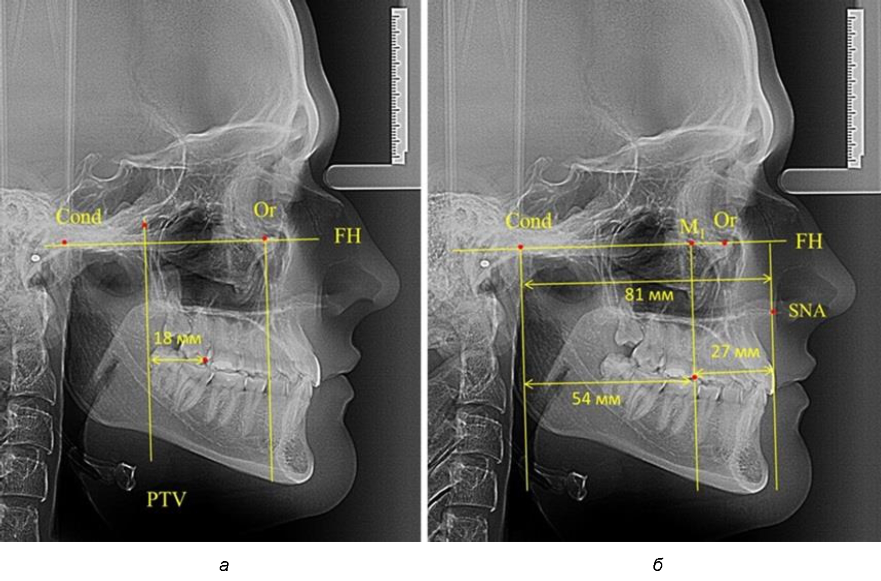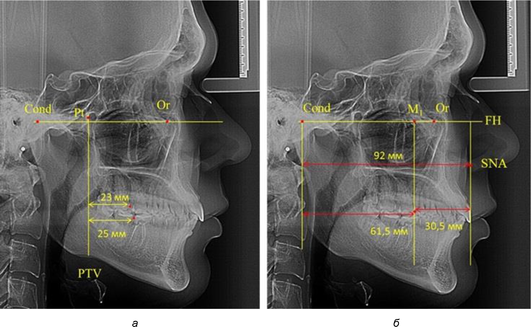 Рис. 3. Особенности положения первых моляров по R. E. McDonald (а) и по предложенному методу (б) при увеличенном молярно-крыловидном расстоянии