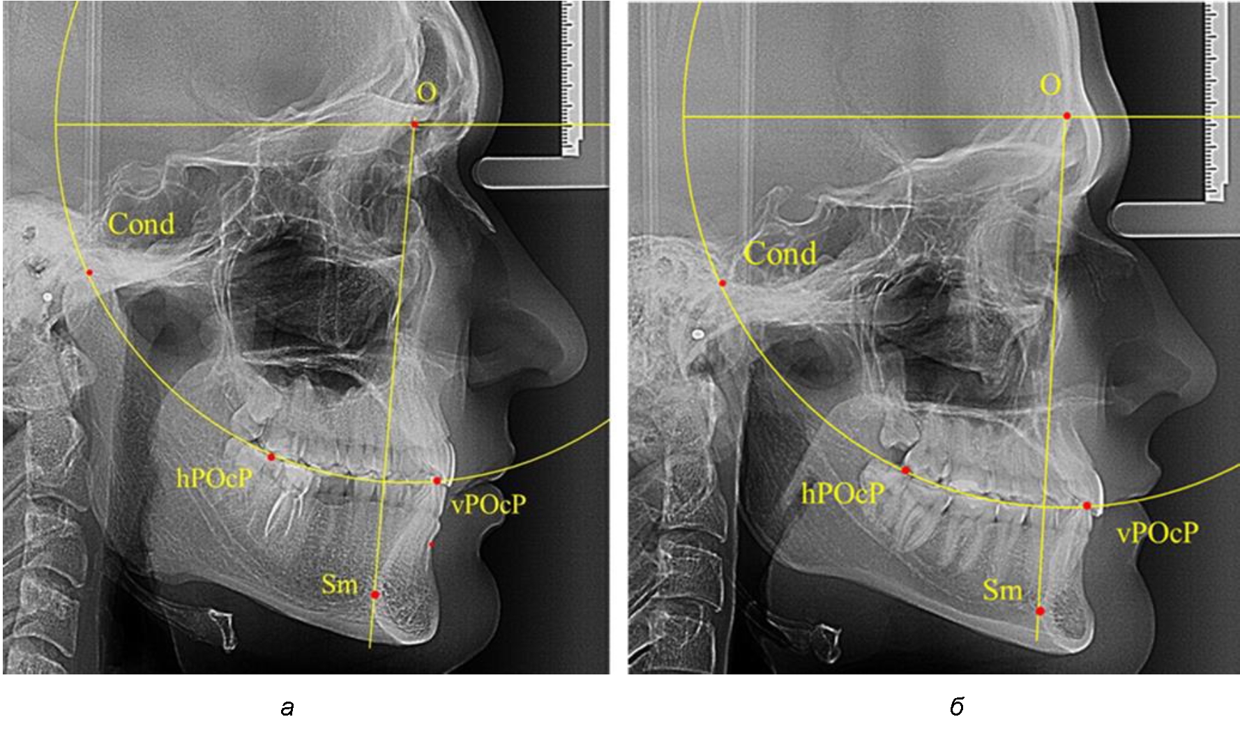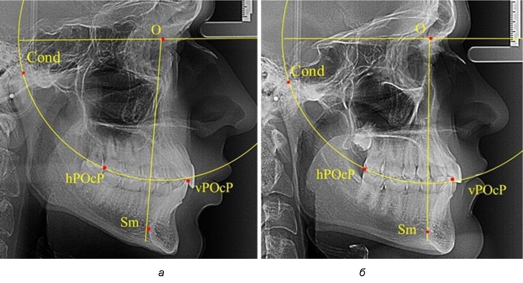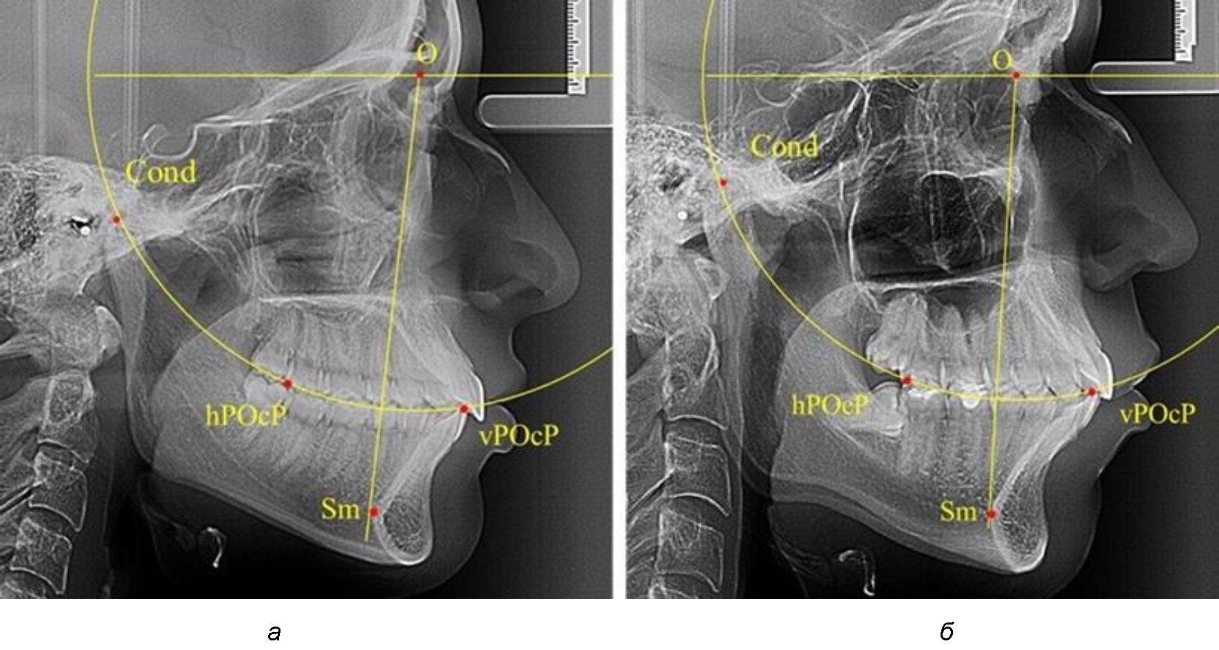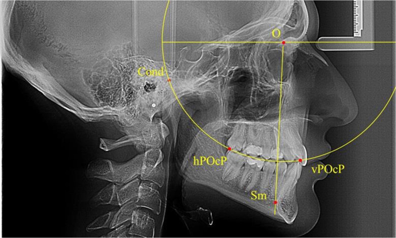 Анализ снимков проводили с использованием традиционного построения стресс-оси по Bimler. Для удобства построения использовали компьютерную программу PowerPoint. Основными точками для построения круга были передняя (vPOcP) и дистальная (hPOcP) окклюзионные точки, а также верхняя выпуклость суставной головки (Cond).