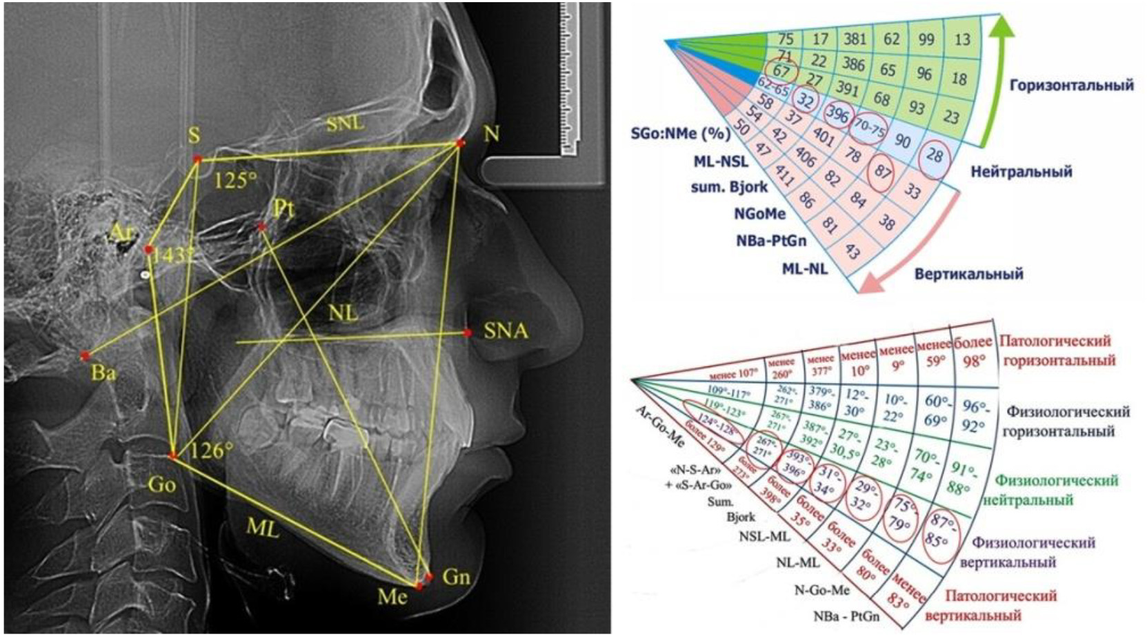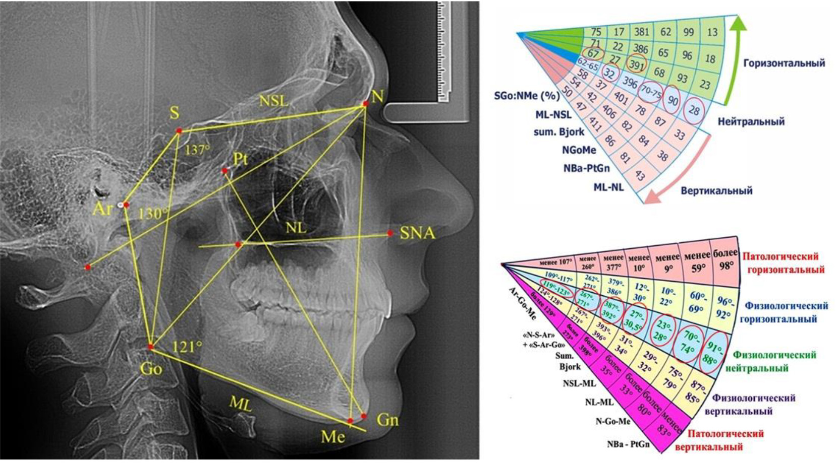 The analysis of the angular parameters of telerentgenograms aimed at determining the typological variants o the facial region of the head is still relevant and requires additions and improvements. Goal. To conduct a comparative analysis of various methods for determining the types of facial growth, including author's additions, in the physiology and pathology of occlusion on a telerentgenogram in lateral projection. Materials and methods. The retrospective study included the analysis of 46 telerentgenograms with physiological occlusion and 23 images with dental-alveolar and gnatic malocclusion. Traditional research methods were used in the analysis. The parameters of the total Bjork angle, the Ricketts facial angle, the lower gonial angle, and the angles determining the position of the mandibular plane to the base of the skull and the base of the upper jaw were determined. The analysis used a generally accepted sectoral chart of the types of facial head growth. Results and discussion. The total Bjork angle was (389.47 ± 1.46)°. The lower gonial angle was (71.26 ± 1.39)°. The facial angle of Ricketts in the whole group was (90.69 ± 0.72)°. The angle NSL-ML was (29.13 ± 1.28) degrees, and the angle NL-ML was (24.41 ± 1.64)°. All parameters were close to the neutral type of growth, however, significant variability of signs was determined. It was noted that the variability of the Bjork angle was usually determined by the magnitude of the mandibular angle, which varied from 110 to 128° during physiological occlusion. The results of the study made it possible to amend the data of the sectoral analysis of facial growth types and conduct a comparative study with generally accepted indicators. Conclusion. An analytical review of methods for assessing the typological features of a face allowed us to modify the sector diagram, which amended the ranges of variability of features and highlighted indicators of physiological and pathological variants of the type of facial growth. The proposed diagram can be used by orthodontists and maxillofacial surgeons when planning the treatment of occlusion anomalies associated with changes in the vertical parameters of the face and its main divisions.