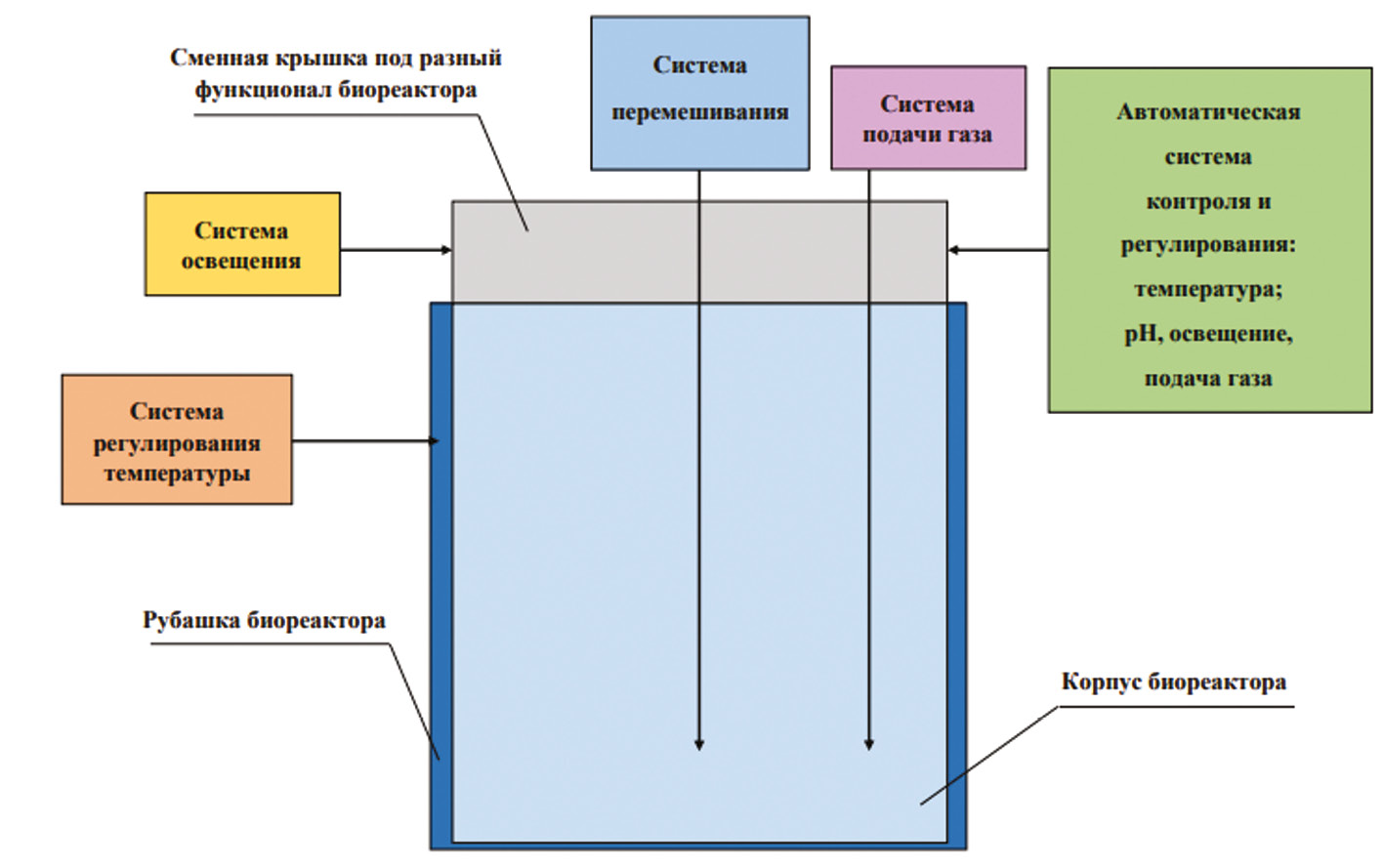 Кроме того, система аэрации в разрабатываемой модели представлена в нескольких вариациях: барботером, как и в представленных аналогах, или помпой с возможностью контроля и регулировки. Биореакторы-аналоги оснащены системой перемешивания либо в виде вала с лопастями, либо наклонного лопастного элемента, либо гребного винта. Система перемешивания у разрабатываемого биореактора представлена либо верхнеприводной, либо магнитной мешалкой. Также есть возможность оснащения его системой освещения, что позволяет выращивать фототрофные микроорганизмы. В разрабатываемой модели предусмотрен отдельный блок, где размещаются все контролирующие и регулирующие элементы.