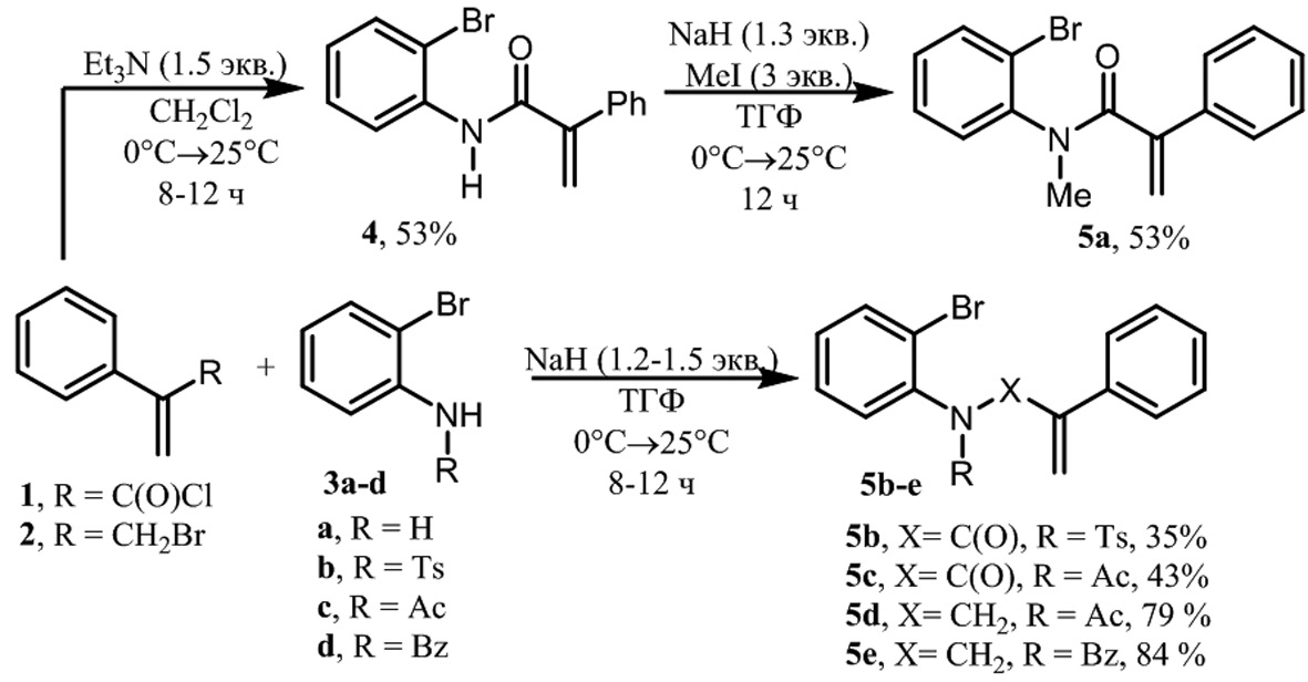 Результаты. Первоначально осуществляли синтез исходных 2-фенилакриламидов 5a-c реакцией ацилирования соответствующих орто-бромпроизводных 3a-c 2-фенил-акрилоилхлоридом 1. Чтобы получить амид с метильной группой при атоме азота 5a дополнительно вводили стадию алкилирования йодистым метилом. Синтез 2-фенил-аллиламидов 5d,e проводили по реакции нуклеофильного замещения α-бромметилстирола 2 соответствующими орто-бромпроизводными 3c,d в присутствии гидрида натрия (рис. 1).