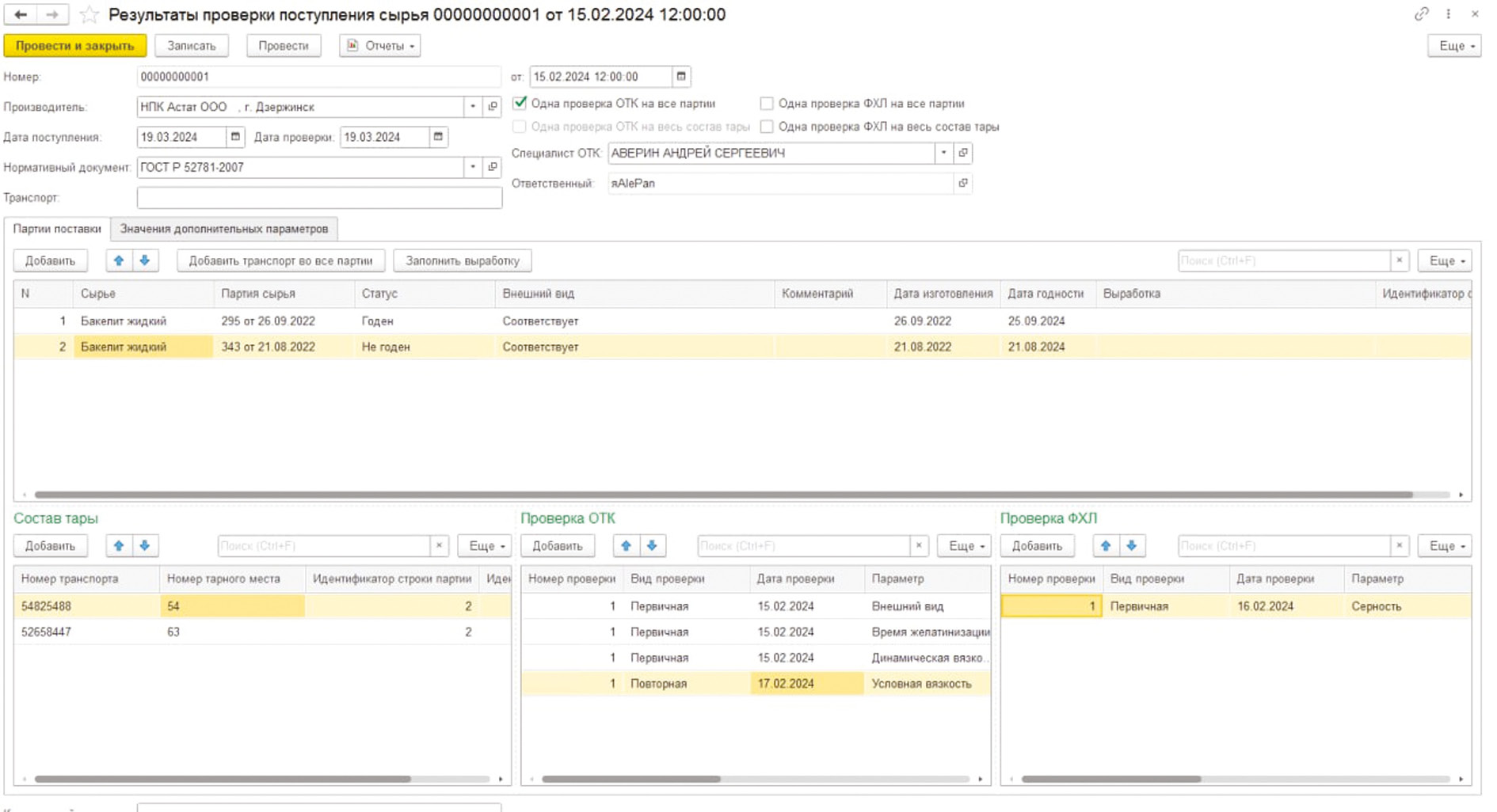 Рис. 1. Форма «Результаты проверки поступления сырья»