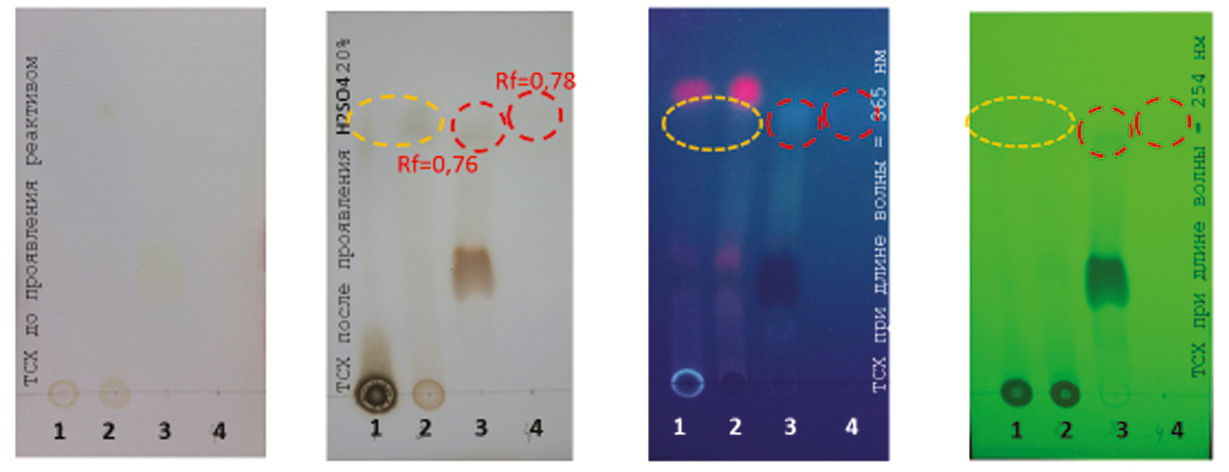 Рис. 1. Хроматограмма разделения в системе хлороформ — этанол (2 : 1): 1 — ацетоновое извлечение сиропа; 2 — спиртовое извлечение листьев эвкалипта прутовидного на 70 %-ном спирте (1 : 100); 3 — стандартный образец эвкалимина; 4 — стандартный образец цинеола
