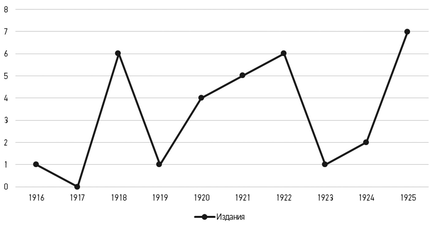 Произведения С.А. Есенина активно печатались при его жизни. Первой из известных публикаций было стихотворение «Береза» в детском журнале «Мирок» в январе 1914 года. Первым прижизненно напечатанным сборником стала «Радуница», 1916 г. На основе данных о печати авторских сборников С.А. Есенина в период 1916–1925 годов (рис. 1) можно проанализировать его писательскую и публикационную деятельность.