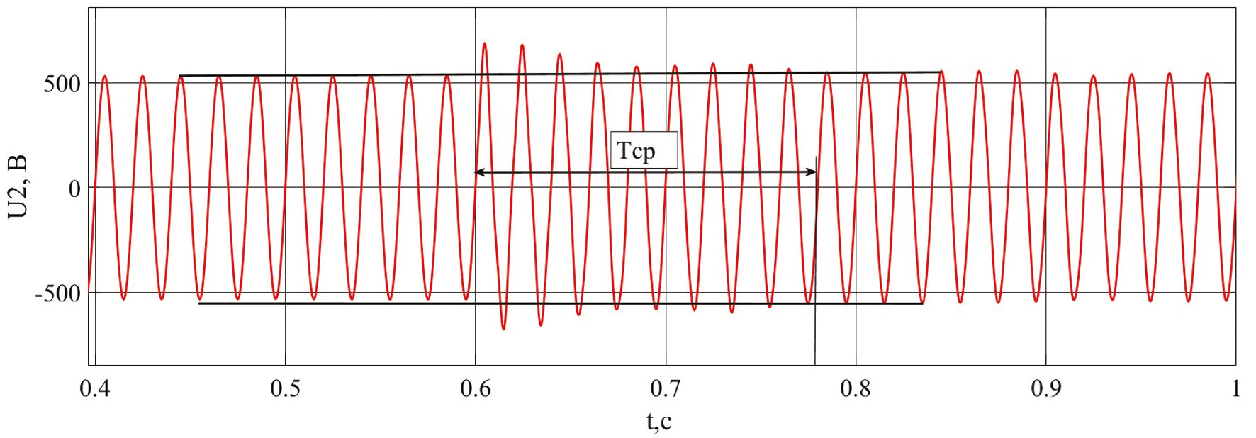 С помощью программного комплекса MATLAB с расширением Simulink для исследований переходных процессов в автономной системе электроснабжения на базе синхронного генератора с приводом от вала отбора мощности газовой турбины была исследована имитационная модель. Анализ работы системы показал хорошие результаты по качеству выходного напряжения при изменении нагрузки [6] (рис. 3). Осциллограмма изменения выходного напряжения при работе системы управления при увеличении частоты вращения вала на 5 % имеет едва заметное изменение, что показывает очень быструю реакцию системы управления.