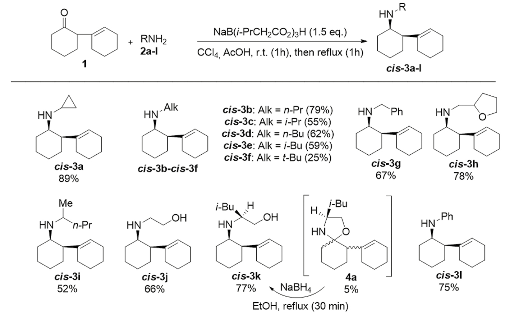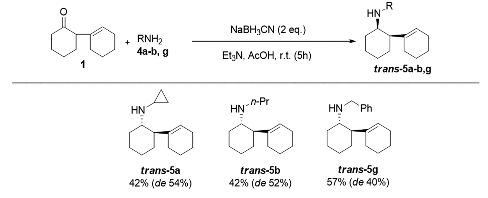 Предположив возможность специфической сольватации интермедиата электронодонорным растворителем (Et3N), а также с учетом малого размера NaBH3CN, нами был разработан транс-диастереоселективный метод получения вторичных аминов (рис. 2). В связи со сложностью метода, представлено три примера синтеза вторичных аминов транс-конфигурации.