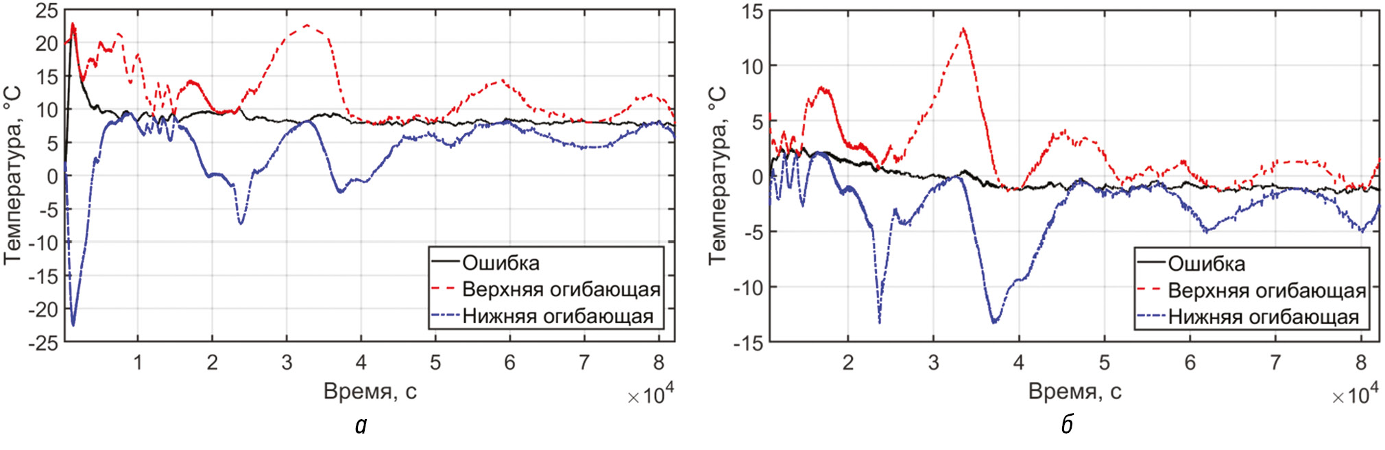 Расчет на участке медленного изменения температуры позволил добиться лучшего качества моделирования: ошибка стала заметно ниже, а ее смещение к концу интервала стремится к нулю (рис. 1).