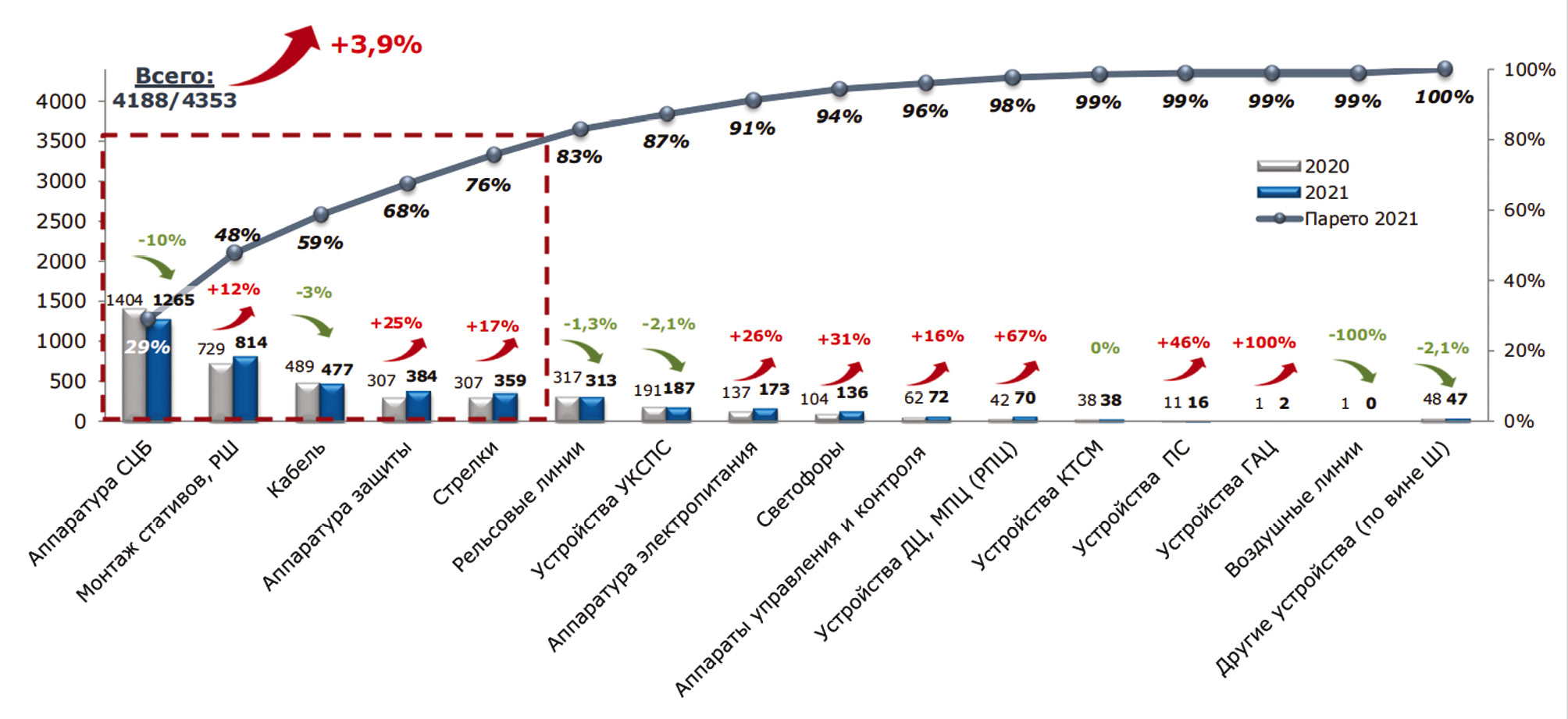 Рис. 1. Распределение Парето отказов технических средств железнодорожной автоматики и телемеханики 1,2 категории по устройствам